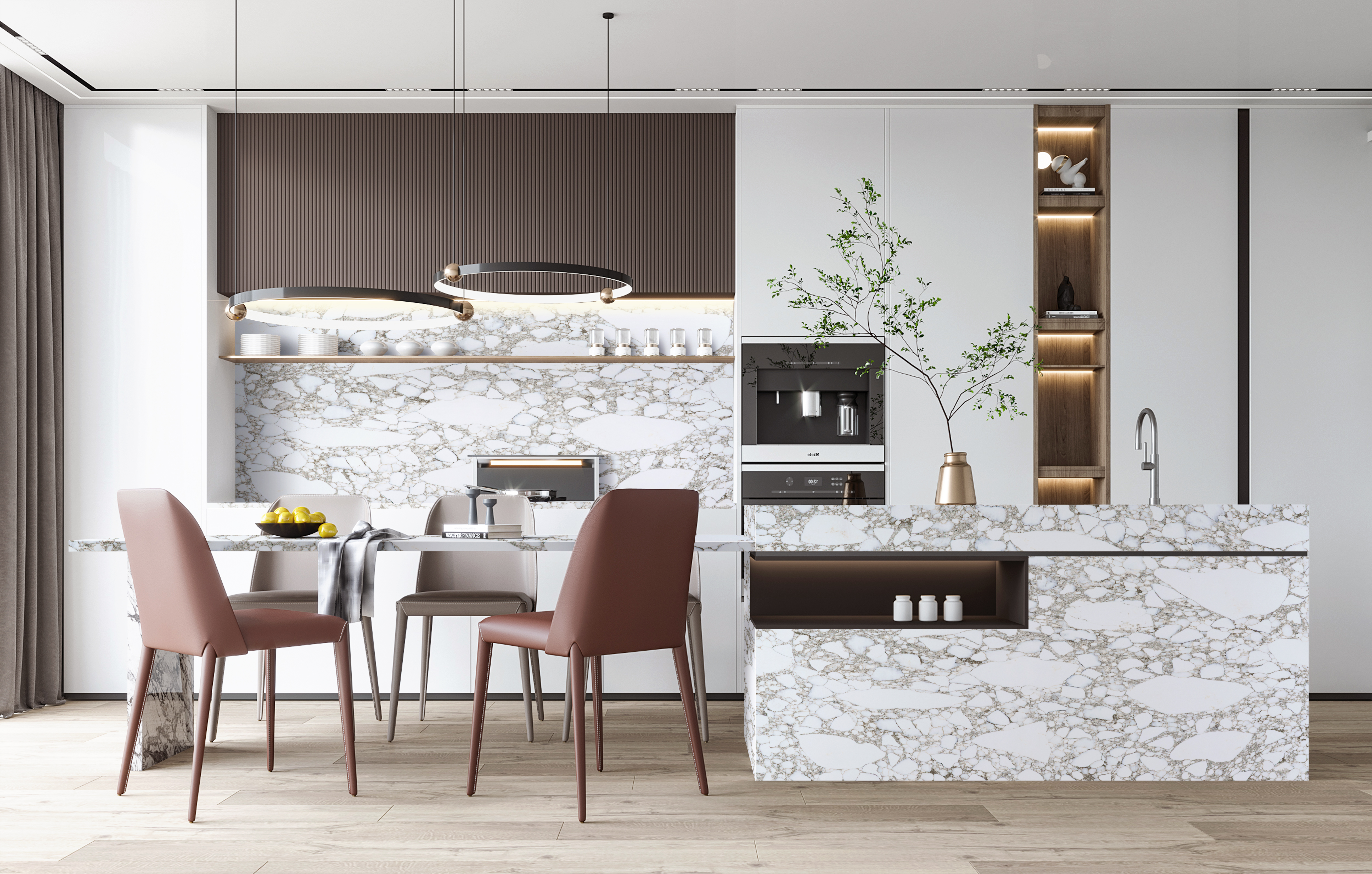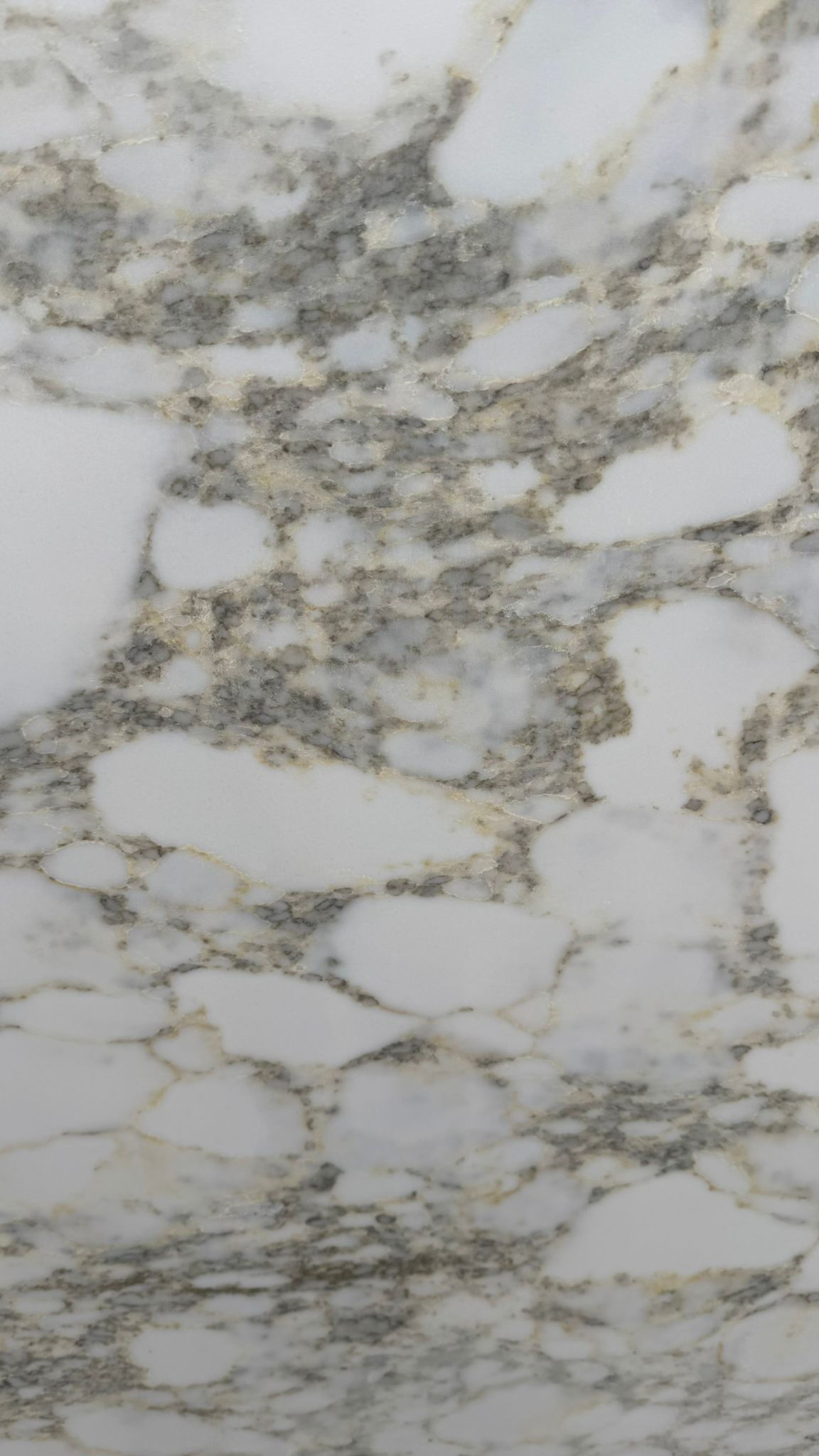 iStone Arabescato Gold Zero Silica imitates the look of natural stone, featuring a white base with elegant gold and grey movement. It is a very popular colour.